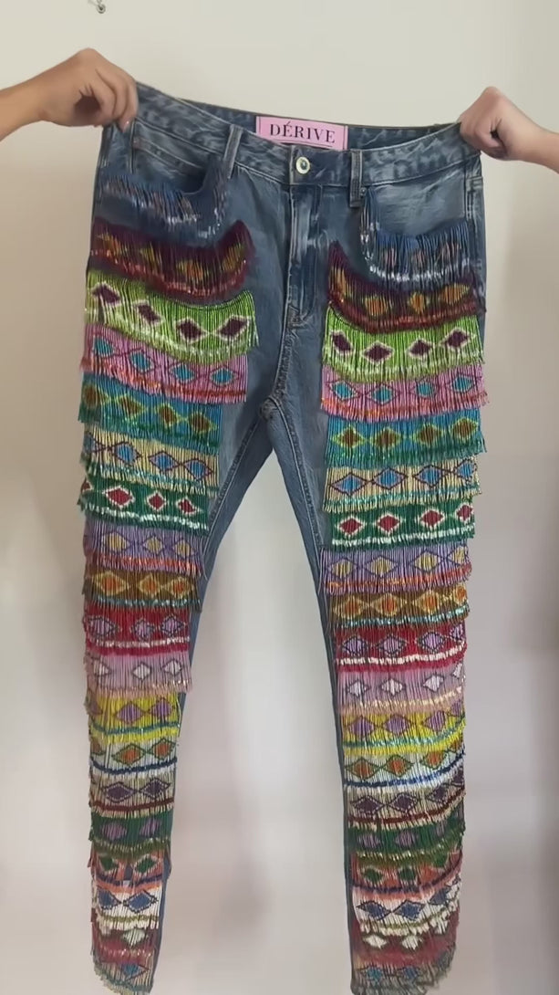 The fringes are handwoven by indigenous artisans in the south of Colombia using ancestral beading techniques, making every piece unique and deeply time-intensive.
